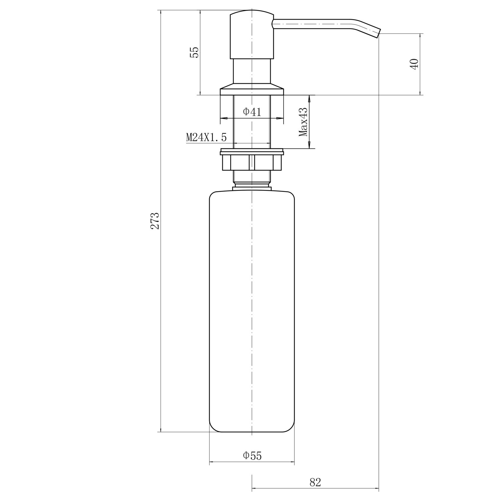 Дозатор для кухонной мойки с колбой, Н=273 мм, H внешней части =55 мм, D нажимного элемента =26 мм